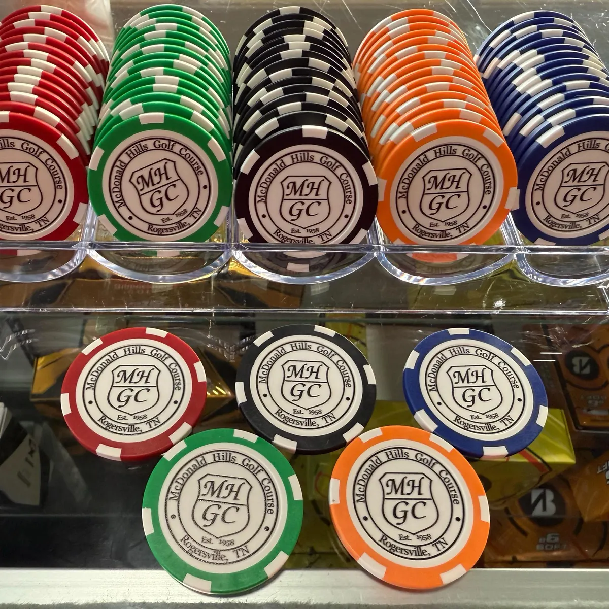 Casino-weight, 39mm — the standard size for ball markers. UV-printed logo, ready for the green. Popular with golf courses and club events.