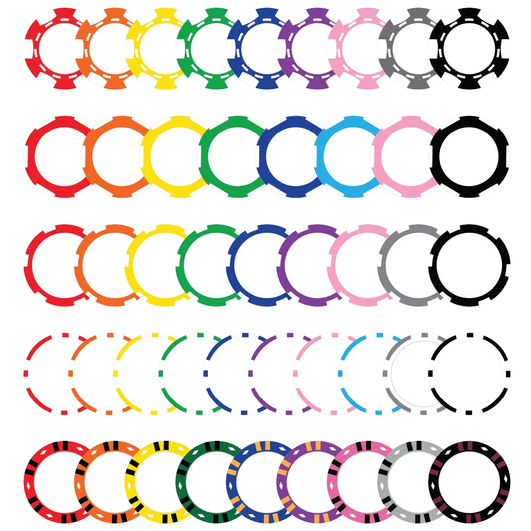 Classic casino-style six-stripe edge. Nine colors including Purple and Grey — a strong all-around choice for bar tokens, branded giveaways, and themed sets.